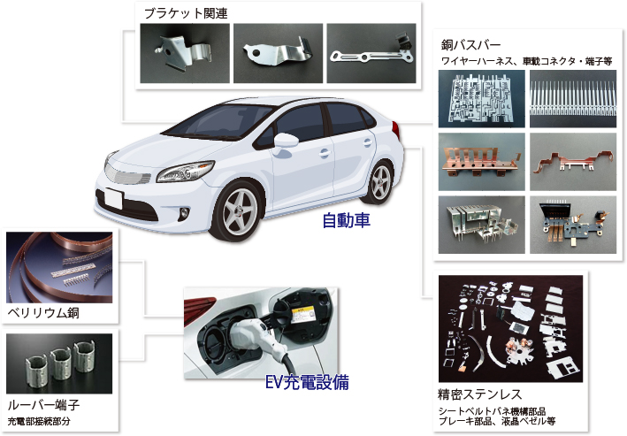 今後成長が期待される新エネルギー自動車の電裝システム(ワイヤーハーネス、車載コネクタ?端子)に使われるステンレスやアルミ?銅合金、メッキ材などを幅広く供給しています。自社の加工拠點を活用することで、バスバーやインサート成形品での供給も可能です。